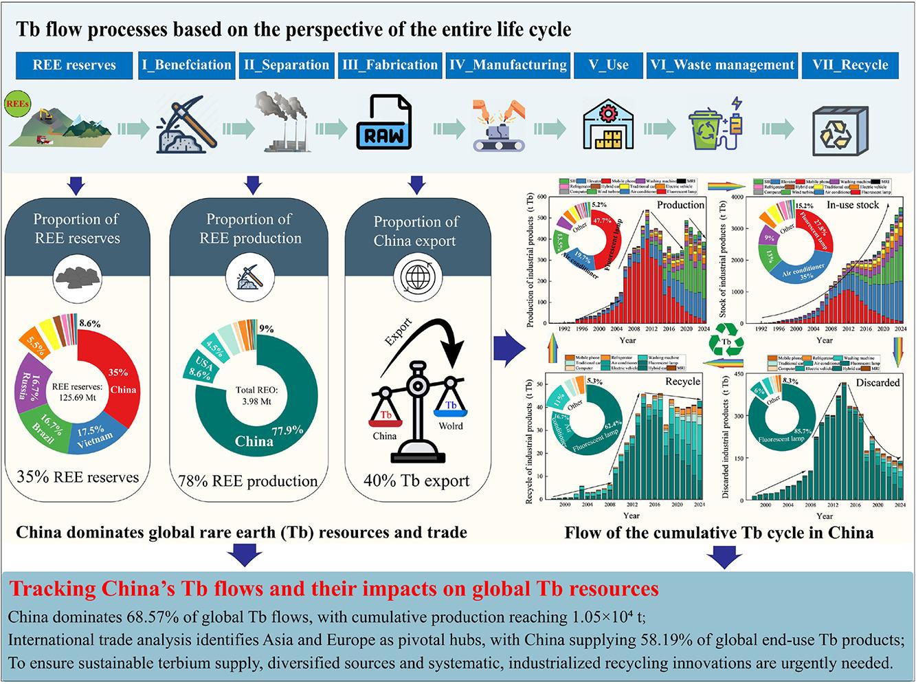 Using a spatially and temporally explicit material flow analysis (MFA) spanning 1990–2024, the team maps how terbium is mined, refined, manufactured, traded, used, discarded, and potentially recycled—finding that China accounts for 68.57% of global Tb flows and that clean-tech electrification is steadily shifting Tb demand from lighting phosphors toward permanent magnets.